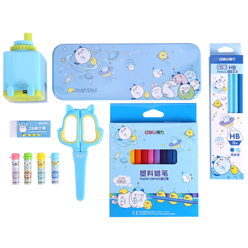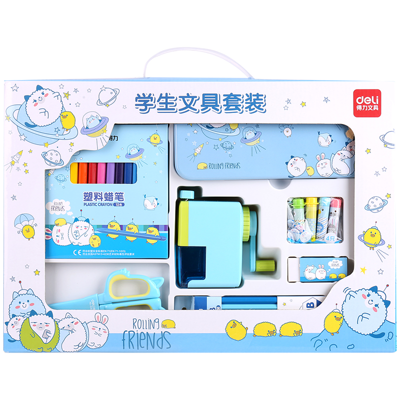 • 得力(deli)萌趣系列1-3年级小学生开学文具礼盒套装 大礼包学习用品7件套蓝色9677双个装
