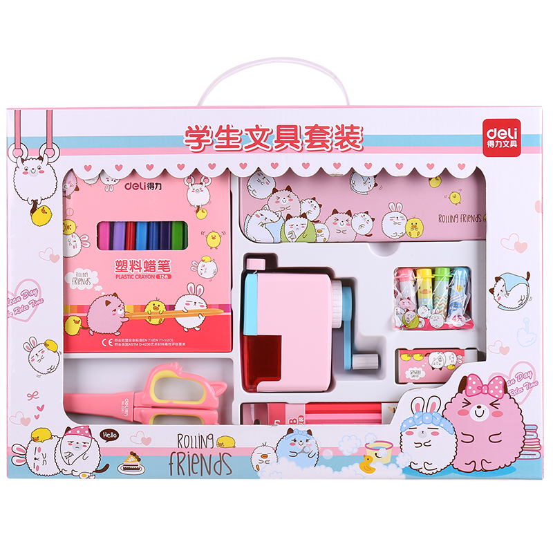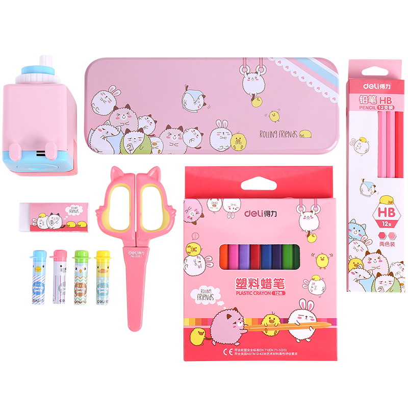 • 得力(deli)萌趣系列1-3年级小学生开学文具礼盒套装 大礼包学习用品7件套粉色9677双个装
