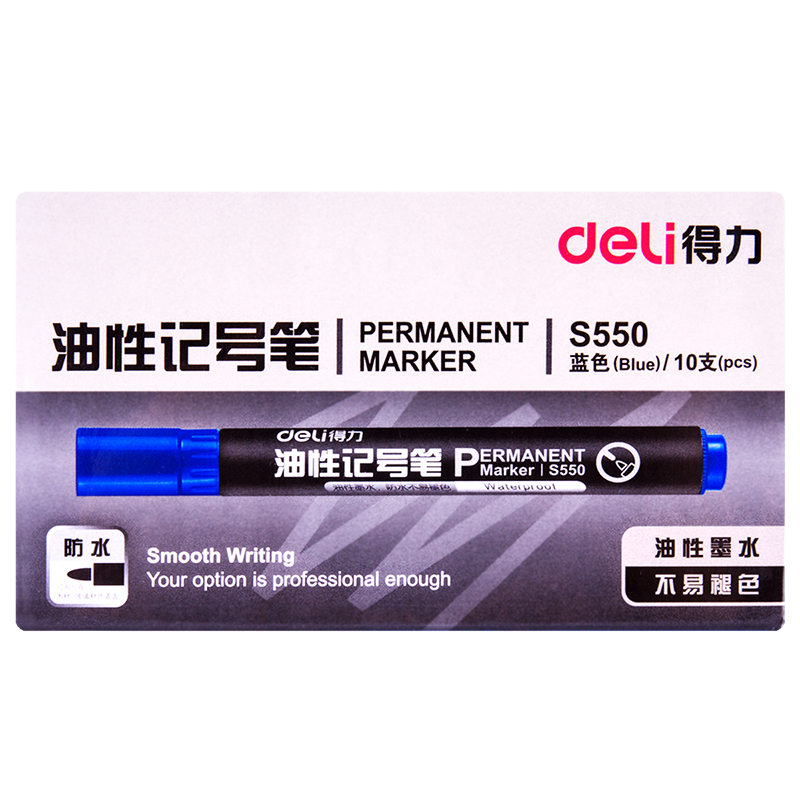 得力(deli)蓝色油性粗头记号笔 10支/盒 S550