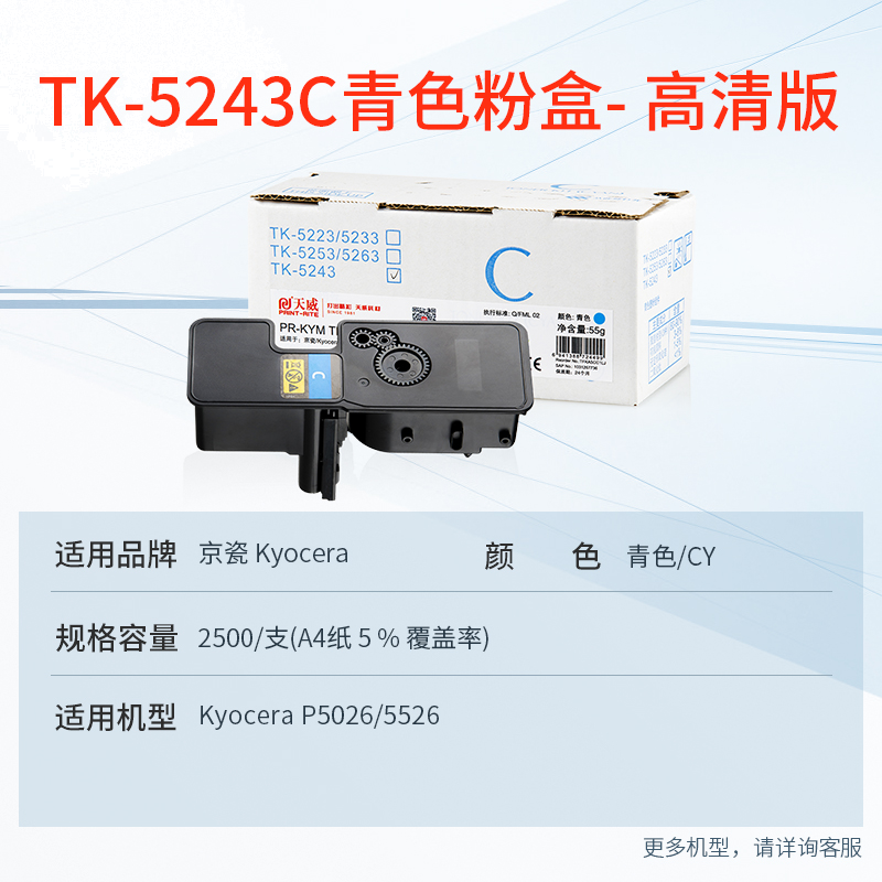 天威 TK-5243粉盒 青色 适用京瓷KyoceraP5026碳粉M5526复印机墨粉TK-5243C墨盒粉筒粉仓