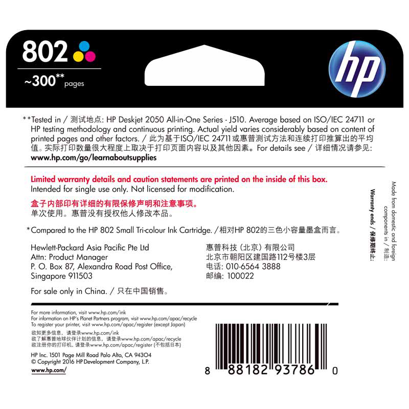 惠普(HP)CH564ZZ 802彩色墨盒(适用HP Deskjet1050/2050/1010/1000/2000/1510/1511)