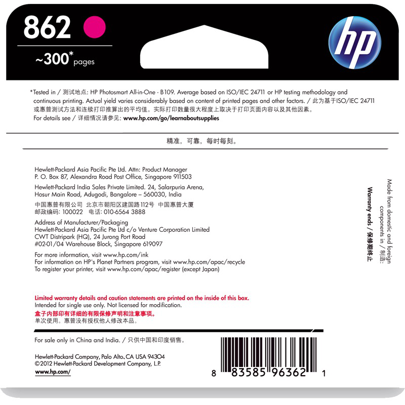 惠普(HP)CB319ZZ 862号品红色墨盒(适用HPPhotosmartC5388B210aB110a6510Photosmart7510)