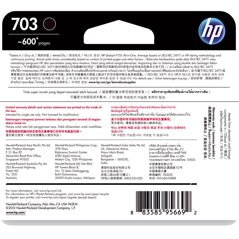 惠普(HP)CD887AA 703号黑色墨盒(适用DJ F735 D730 K109a/gK209a/gPhotosmartK510a)