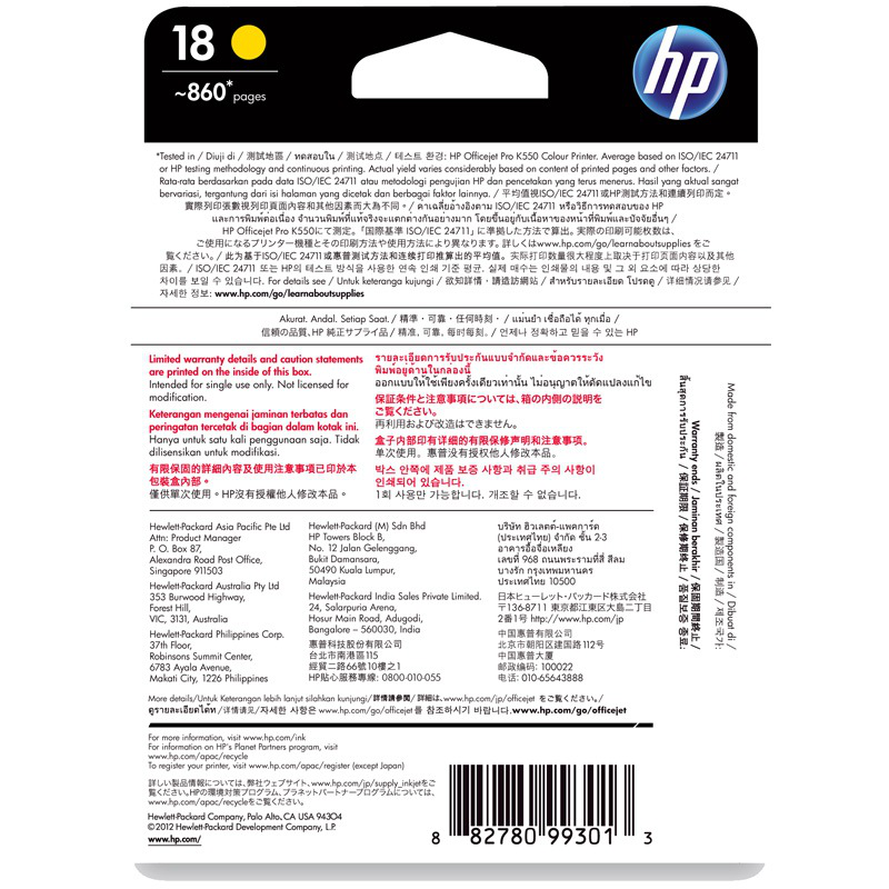 惠普(HP)C4939A 18号 黄色墨盒(适用HPOfficejetL7380,L7580,L7590,ProK5300,K5400dn,K8600)