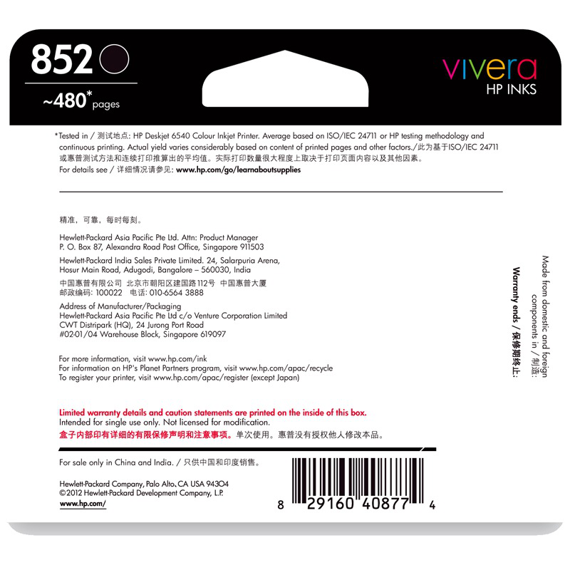 惠普(HP)C8765ZZ 852号 黑色墨盒(适用B8338 Deskjet 9808OfficejetH470b)