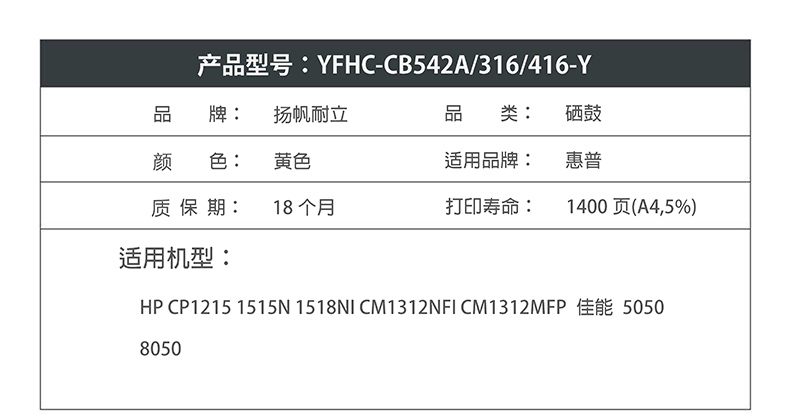 扬帆耐立CB542A 黄色硒鼓 适用惠普 CP1215 1515N 1518佳能 5050 MF80