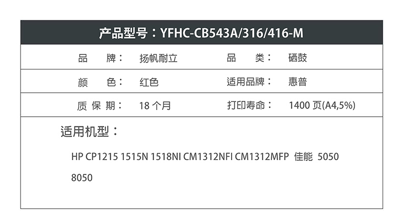 扬帆耐立CB543A 红色硒鼓 适用惠普 CP1215 1515N 1518佳能 5050 MF80