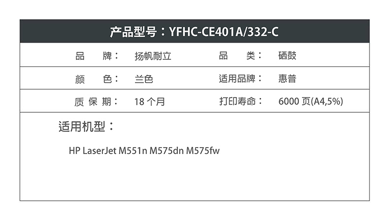 扬帆耐立CE401A硒鼓兰色粉盒适用惠普M551n/M575dn/M575fw-商专版