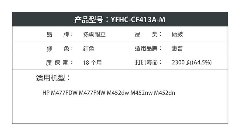 扬帆耐立CF413A(410A)硒鼓红色适用惠普 M477FDW/M477FNW/M452dw/M4