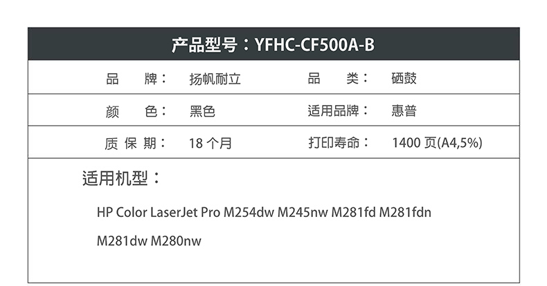 扬帆耐立CF500A(202A)黑色硒鼓 适用惠普M254dw/M245nw/M281fd/M281