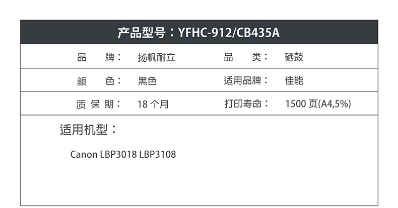扬帆耐立 CRG912/CB435A硒鼓 适用佳能LBP3018 LBP3108黑色-商专版