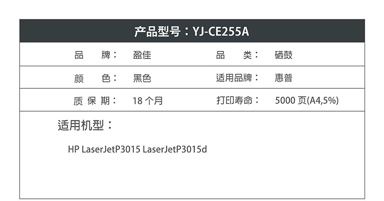 盈佳CE255A硒鼓适用惠普HP LaserJetP3015 P3015d-商专版