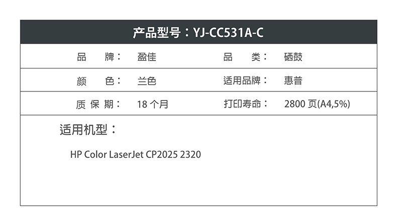 盈佳CC531A硒鼓兰色304A适用HP Color LaserJet CP2025 2320-商专