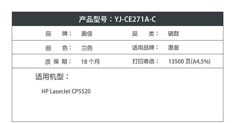 盈佳CE271A(650A)硒鼓兰色适用惠普HP LaserJet CP5520-商专版