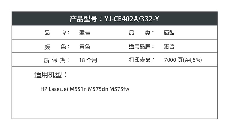 盈佳CE402A(507A)/332硒鼓黄色适用惠普HP LaserJet M551n M575dn