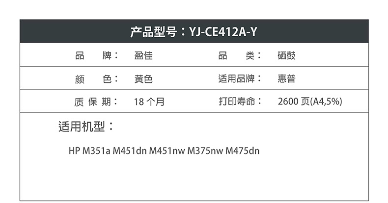 盈佳CE412A硒鼓黄色305A适用惠普M351a M451dn M451nw M375nw M47