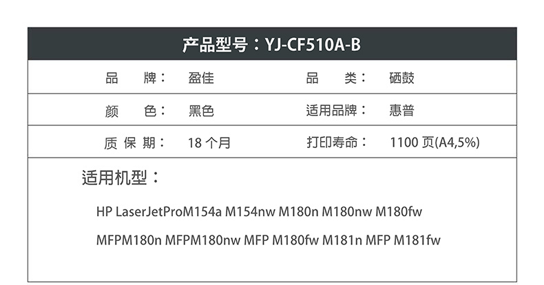 盈佳CF510A(204A)硒鼓黑色适用惠普M154a/M154nw/M180fw/MFPM180n