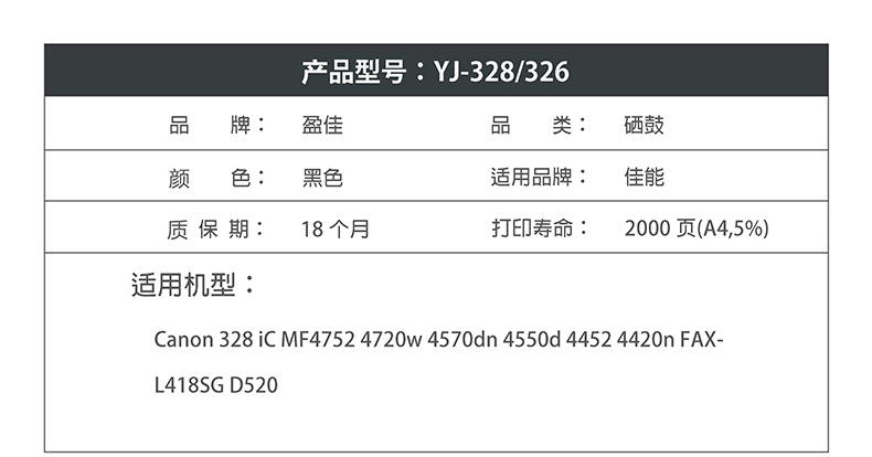 盈佳CRG328/326 黑色硒鼓适用MF4752 4720w 4570dn 4550d 4452