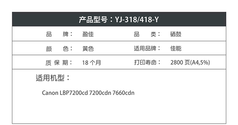 盈佳CN-318/418硒鼓黄色适用佳能LBP7200cd/7200cdn/7660cdn-商专版