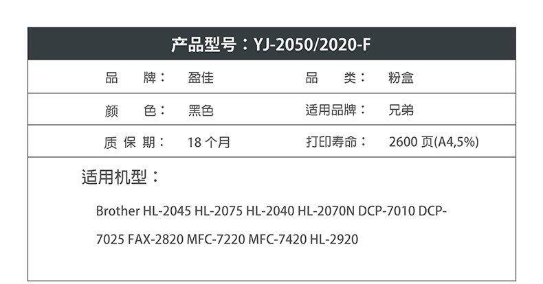 盈佳TN2050/2020粉盒适用兄弟HL-2045 2075 2040 2070N 2920 DC