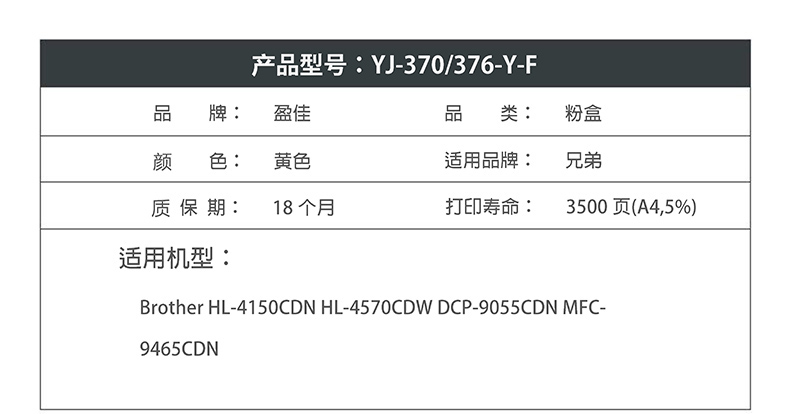 盈佳TN370/376粉盒黄色适用兄弟HL-4150CDN 4570CDW DCP-9055CDN