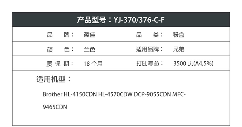 盈佳TN370/376粉盒兰色适用兄弟HL-4150CDN 4570CDW DCP-9055CDN