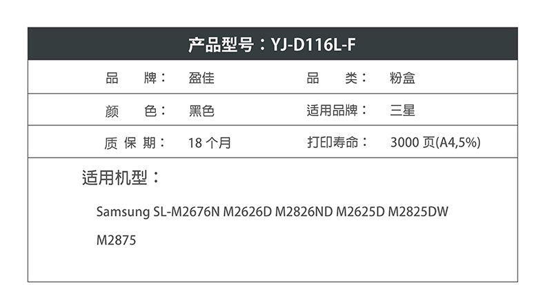 盈佳MLT-D116L墨粉盒适用三星SL-M2676N/M2626D/M2826ND/M2625D/