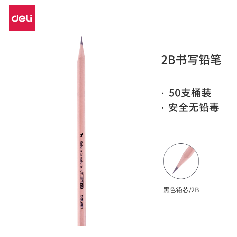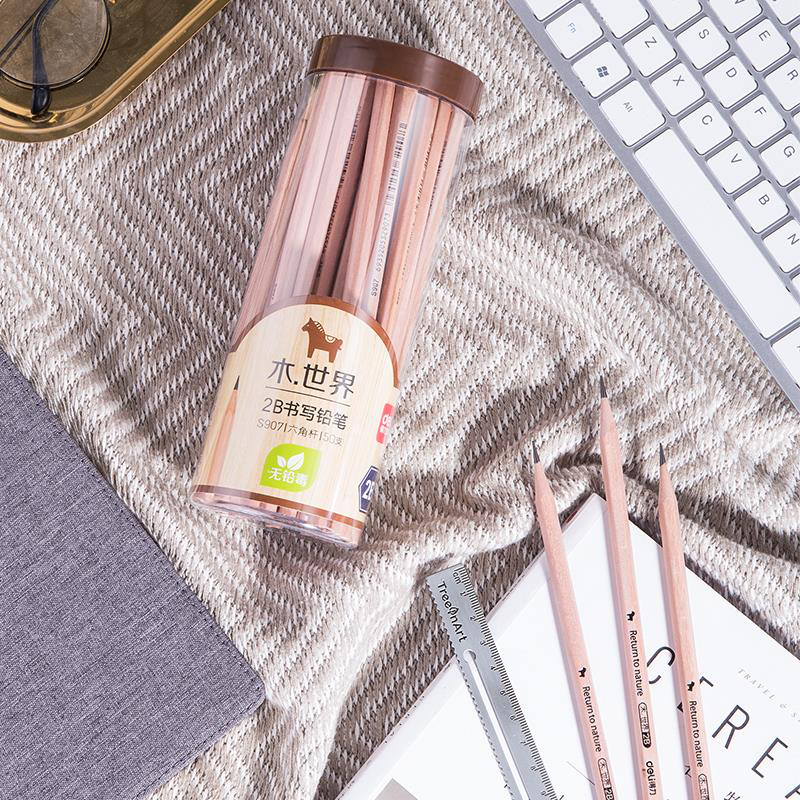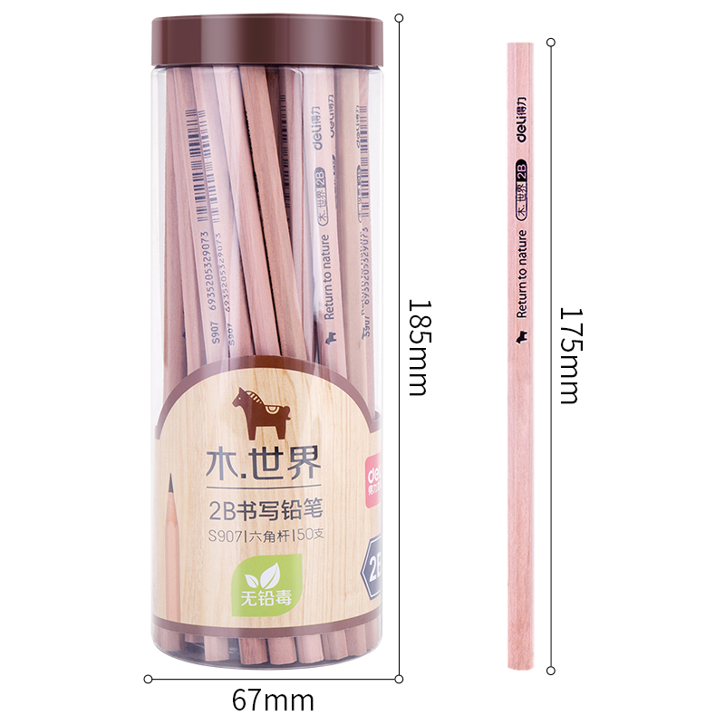 得力(deli)木世界系列六角笔杆原木2B铅笔 50支/桶 S907