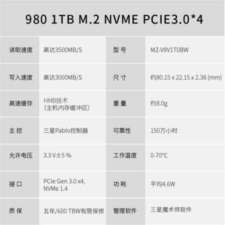 三星(SAMSUNG)1TB SSD固态硬盘 M.2接口(NVMe协议) 980(MZ-V8V1T0BW)