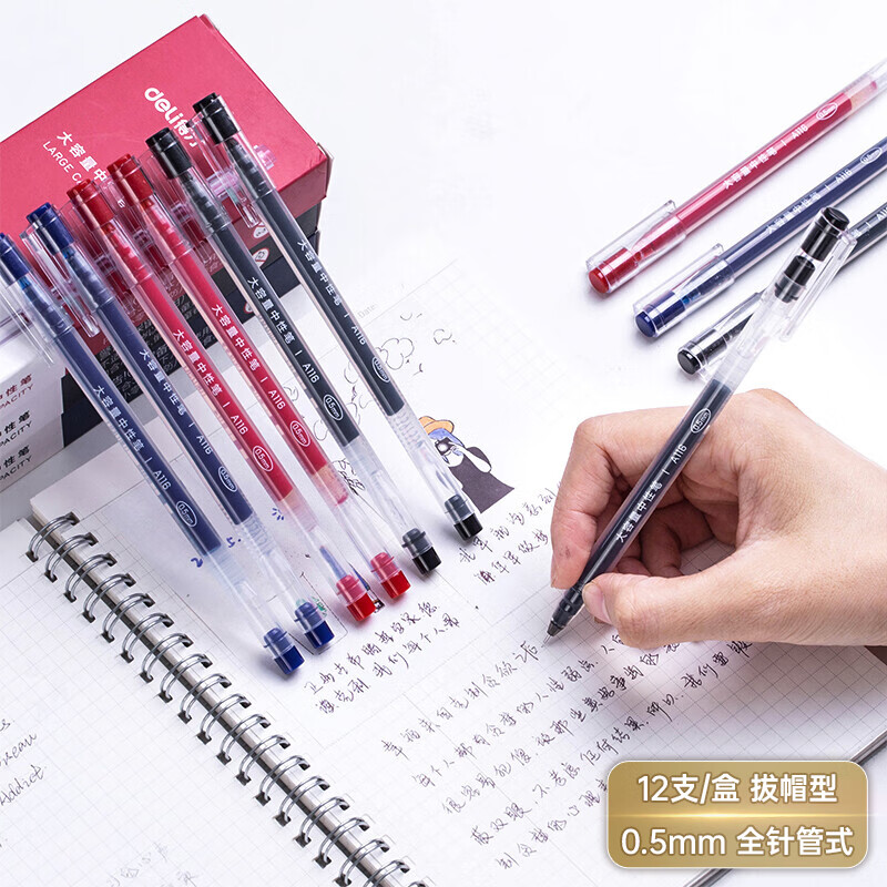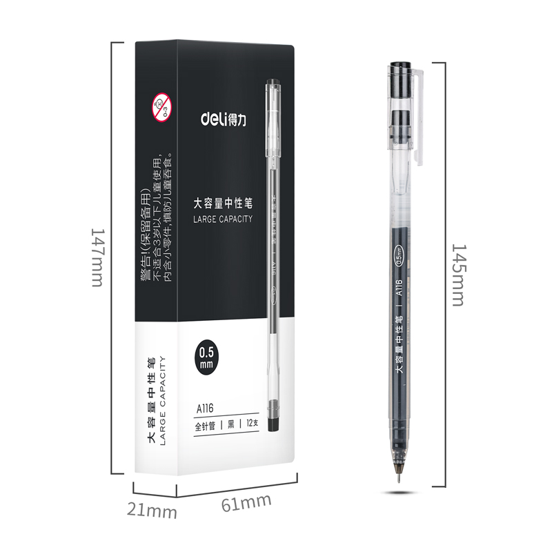 得力(deli)大容量全针管中性笔签字笔 笔芯笔身一体化0.5mm黑色12支/盒 DL-A116 单支
